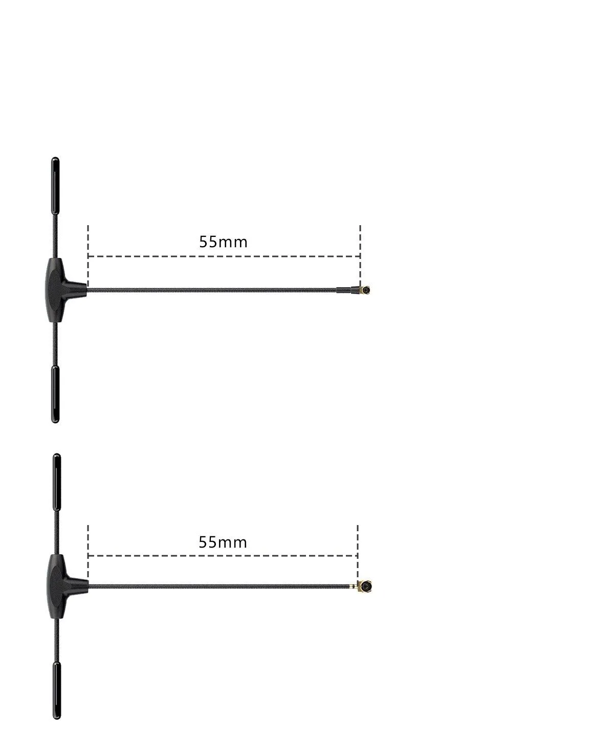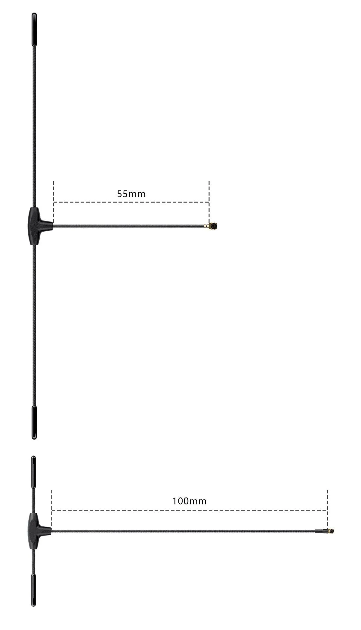 - Длинная версия (100 мм) позволяет вынести антенну над конструкцией дрона для лучшей видимости и дальности приема