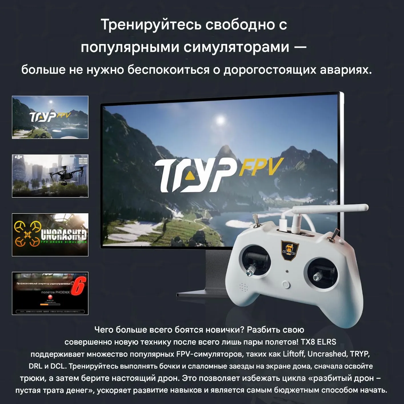- Назначение: FPV-пилотирование, обучение, симуляторы