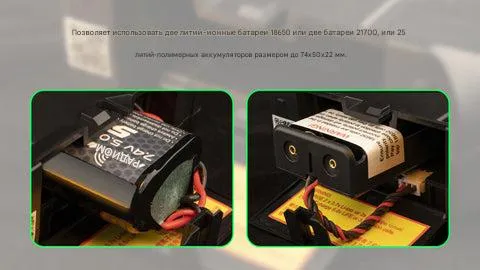 - 2× аккумулятора 18650 / 21700 или 2S LiPo пакет (до 74×60×22 мм)