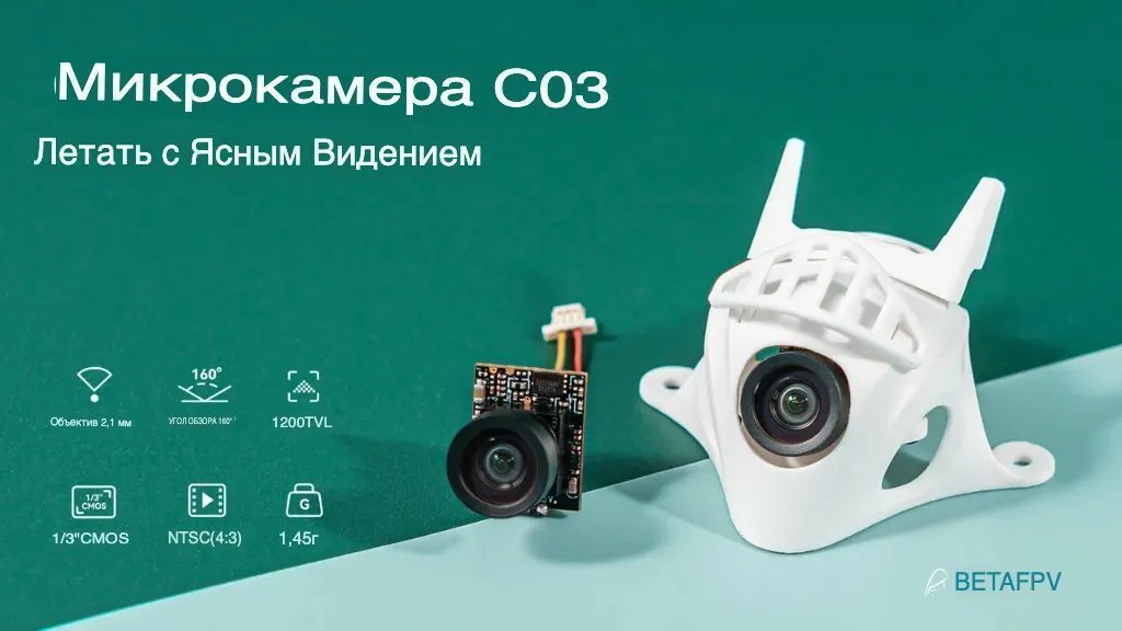 C03 FPV Micro Camera — это ультралёгкая аналоговая FPV-камера с высоким разрешением 1200 ТВЛ, разработанная специально для микро-дронов класса Whoop. Камера оснащена 1/3-дюймовым CMOS-сенсором с технологией Global WDR, 2.1-мм объективом с углом обзора 160° и работает в соотношении сторон 4:3. Вес составляет всего 1.45 г. Поставляется в комплекте с фирменным Micro Canopy BETAFPV и тремя сменными креплениями камеры (20° для C02, 20° для C03, 30° для C03), декоративными элементами и полным набором крепежа. Камера оснащена разъёмом JST-0.8 для беспаечного подключения, что обеспечивает простую и быструю установку на совместимые полётные контроллеры и видеопередатчики.