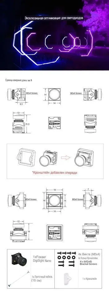 Гибридная FPV-камера ультракомпактного формата Nano (14x14 мм) с сенсором Sony 1/3 дюйма и цифровым разрешением 720P. Ключевая особенность модели — поддержка переключения между аналоговым (CVBS) и цифровым (HD) видеовыходом при подключении к совместимому видеопередатчику, что обеспечивает задержку от 4 мс. Камера оснащена расширенным динамическим диапазоном Super WDR (120 дБ), функциями шумоподавления (3DNR/2DNR), быстрым переключением предустановленных режимов съемки и встроенным OSD-меню на нескольких языках, включая русский.