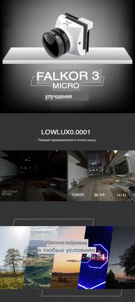 Ультракомпактная аналоговая FPV-камера формата Micro (19x19 мм), представляющая собой уменьшенную версию модели Falkor 3. Оснащена высокосветосильным сменным объективом M12 1.7 мм StarLight и сенсором Sony 1/3 дюйма CMOS. Обеспечивает исключительную чувствительность в условиях низкой освещенности (0.0001 Люкс), разрешение 1200 ТВЛ, низкую задержку (~6 мс) и динамический диапазон 100 дБ. Камера оптимизирована для LED-освещения, поддерживает удаленное управление через OSD-меню и совместима с полетными контроллерами Foxeer.