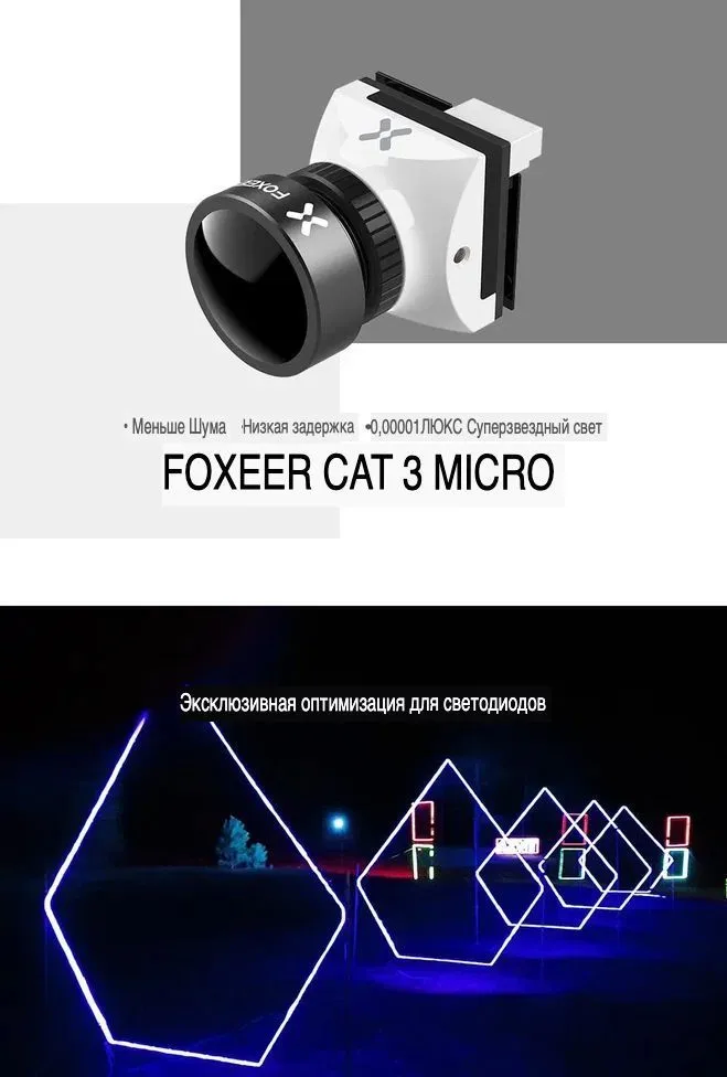 Ультракомпактная аналоговая FPV-камера формата Micro (19x19 мм) с исключительной светочувствительностью, предназначенная для полетов в условиях низкой освещенности. Модель представляет собой уменьшенную версию Cat 3, построена на базе сенсора Sony 1/3 дюйма CMOS и оснащена сменным высокосветосильным объективом M12 2.1 мм (Low Light Lens). Благодаря технологии Super Starlight камера обеспечивает чувствительность 0.00001 Люкс, разрешение 1200 ТВЛ, низкий уровень шума и минимальную задержку. Оптимизирована для LED-освещения, поддерживает удаленное управление через OSD-меню и совместима с полетными контроллерами Foxeer.