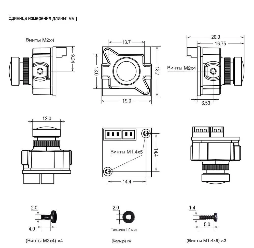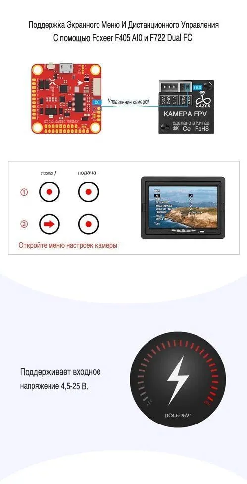 Аналоговая FPV-камера формата Micro (19x19 мм) с низкой задержкой (4 мс) и переключаемой ТВ-системой PAL/NTSC. Модель построена на базе сенсора Sony 1/3 дюйма CMOS, оснащена объективом 1.8 мм и обеспечивает разрешение 1200 ТВЛ. Камера отличается хорошей производительностью при слабом освещении (0.01 Люкс), динамическим диапазоном 90 дБ и широким диапазоном входного напряжения 4.5-25 В.