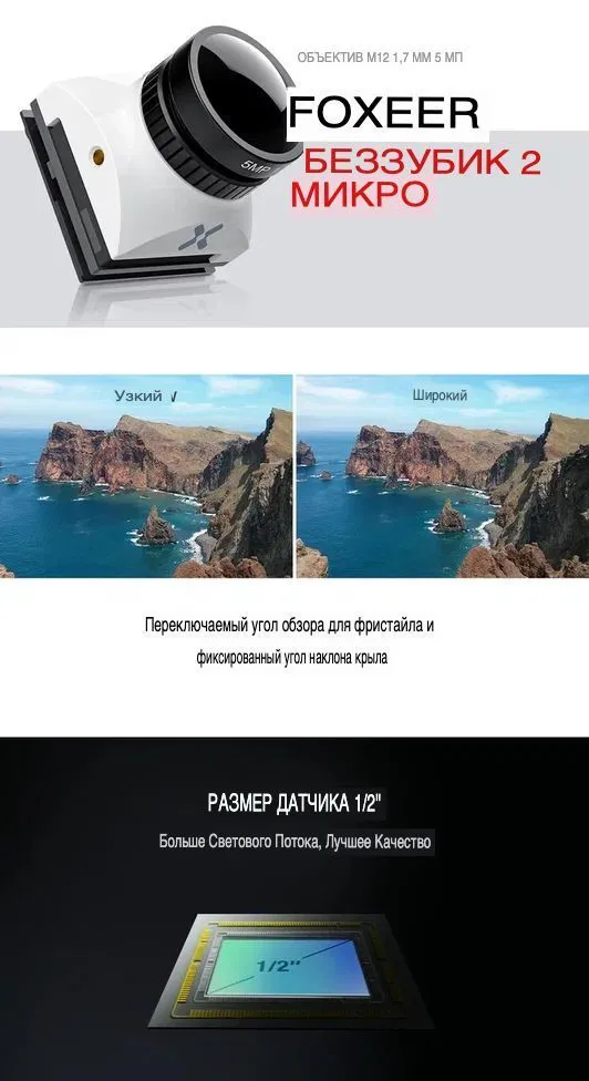 Аналоговая FPV-камера формата Micro (19x19 мм) с уникальной функцией переключения угла обзора (FOV) между широким (Wide) и узким (Narrow) режимами. Модель оснащена сменным высокосветосильным объективом StarLight M12 1.7 мм и сенсором Sony 1/2 дюйма CMOS, обеспечивающими разрешение 1200 ТВЛ, исключительную светочувствительность 0.0001 Люкс и динамический диапазон 100 дБ. Это полноценная всепогодная камера, одинаково эффективная для дневных и ночных полетов, а также для разных стилей пилотирования — от freestyle до планерных полетов.