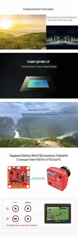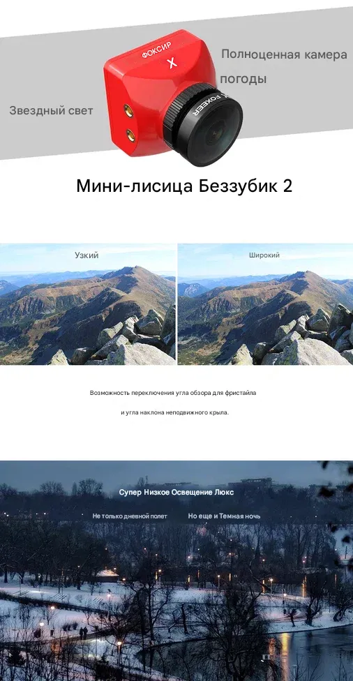Аналоговая FPV-камера формата Mini (22x22 мм) с уникальной функцией переключения угла обзора (FOV) между широким (Wide) и узким (Narrow) режимами. Модель оснащена высокосветосильным объективом StarLight 1.7 мм и сенсором Sony 1/2 дюйма CMOS, обеспечивающими разрешение 1200 ТВЛ, исключительную светочувствительность 0.0001 Люкс и динамический диапазон 100 дБ. Это универсальная всепогодная камера, одинаково эффективная для дневных и ночных полетов, а также для разных стилей пилотирования — от агрессивного фристайла до плавных полетов на планерах.