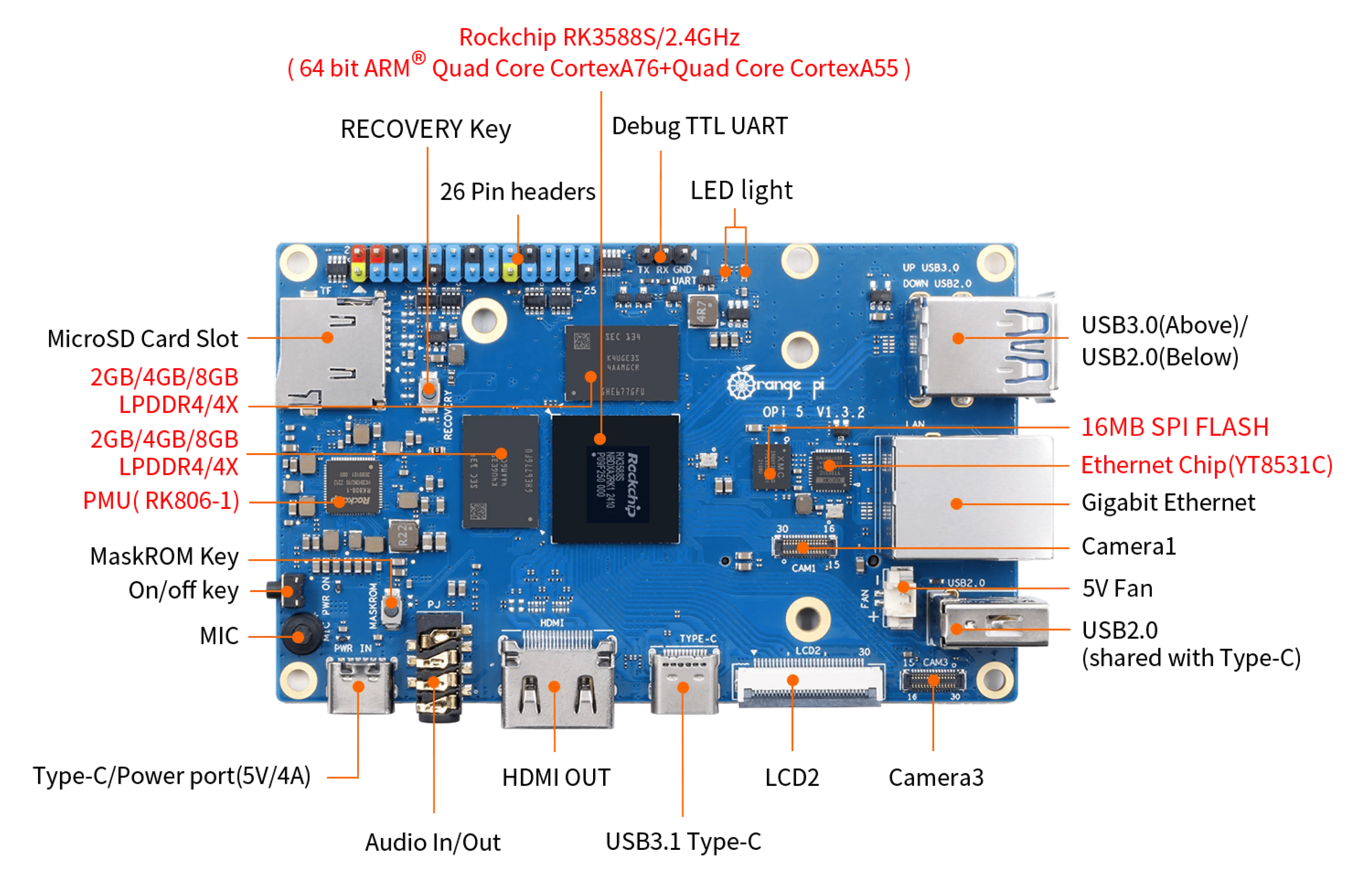 - Процессор: Rockchip RK3588S (8 нм), 8 ядер (4× Cortex-A76 + 4× Cortex-A55, до 2.4 ГГц)