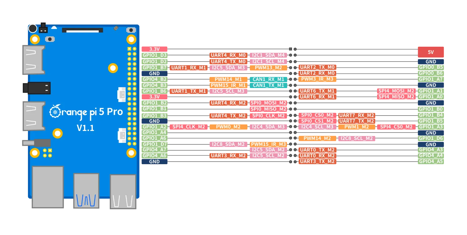 - GPIO : 40 пинов (2.54 мм), питание 5 В и 3.3 В, UART / PWM / I²C / SPI / CAN / GPIO