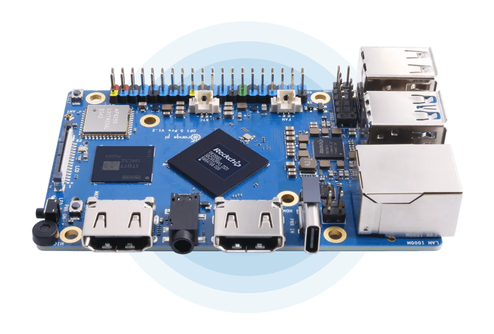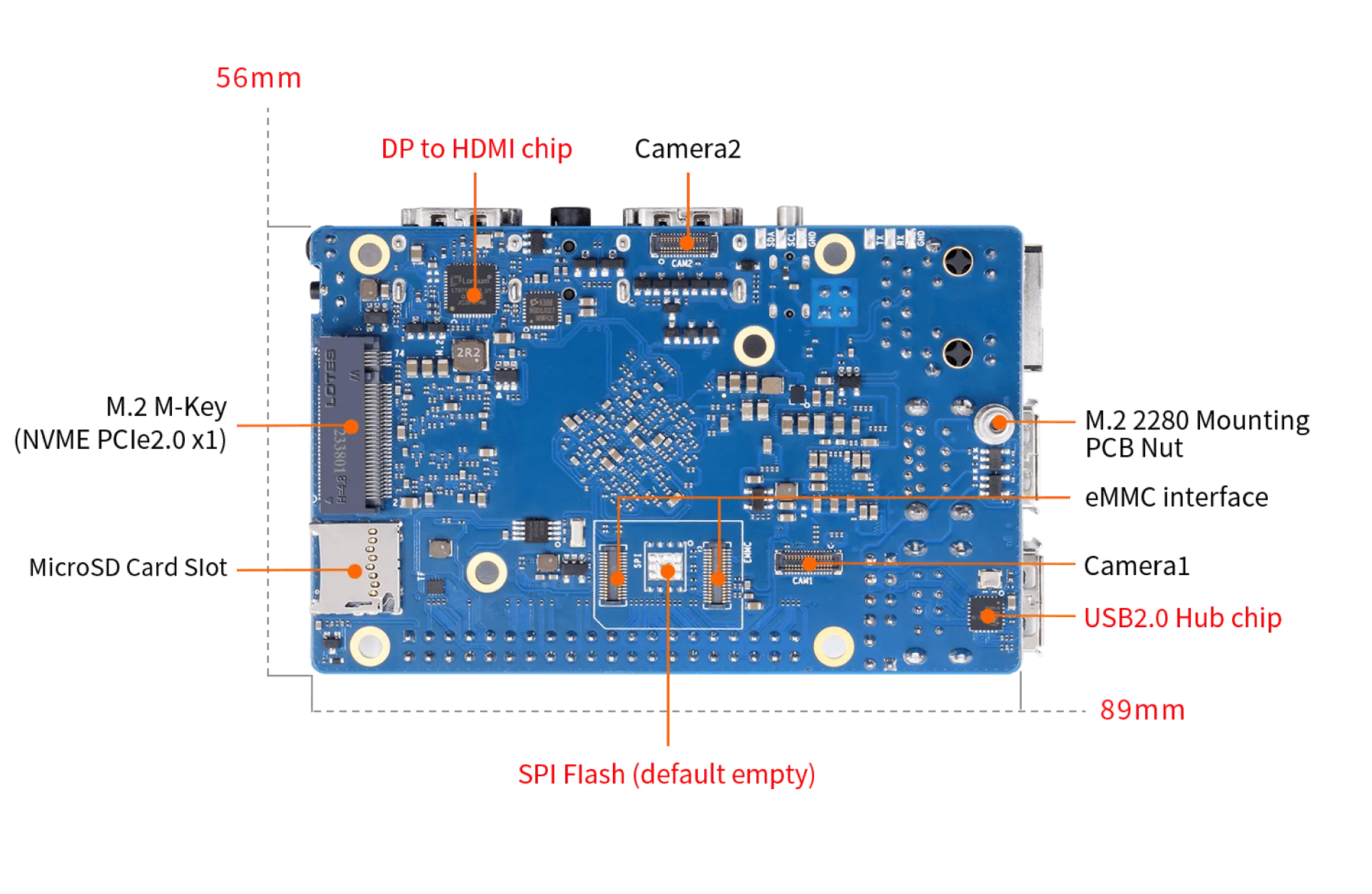 - Хранение : слот eMMC (модуль по выбору) или SPI Flash (по умолчанию пустой), microSD (TF), M.2 M-Key — NVMe SSD или SATA SSD