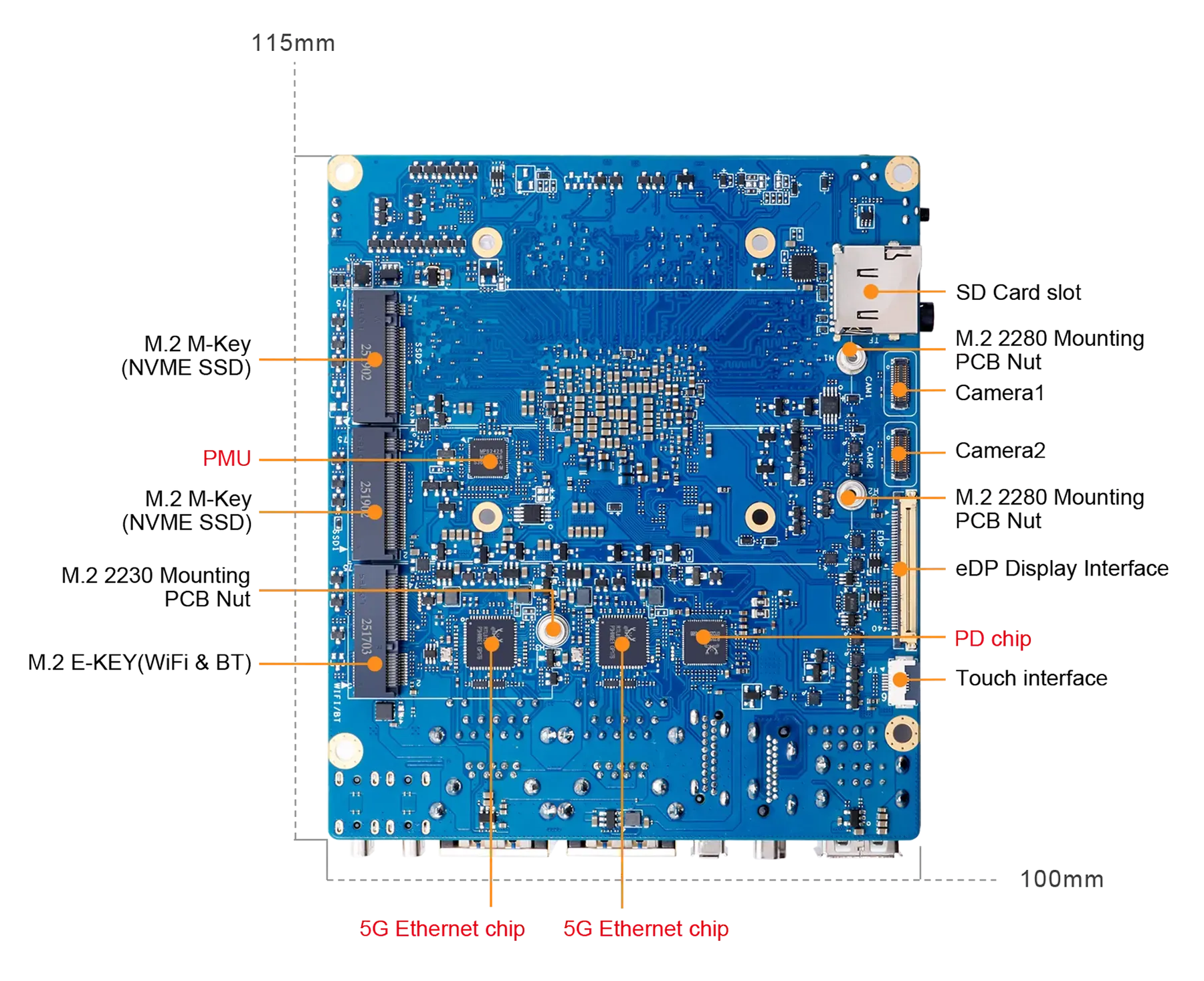 Модуль обеспечивает 45 TOPS вычислительной мощности, два M.2 интерфейса NVMe (2280), двойной 5G Ethernet, интерфейсы HDMI/DP/eDP, а также совместимость с Debian, Ubuntu, Android, Windows и ROS 2.
