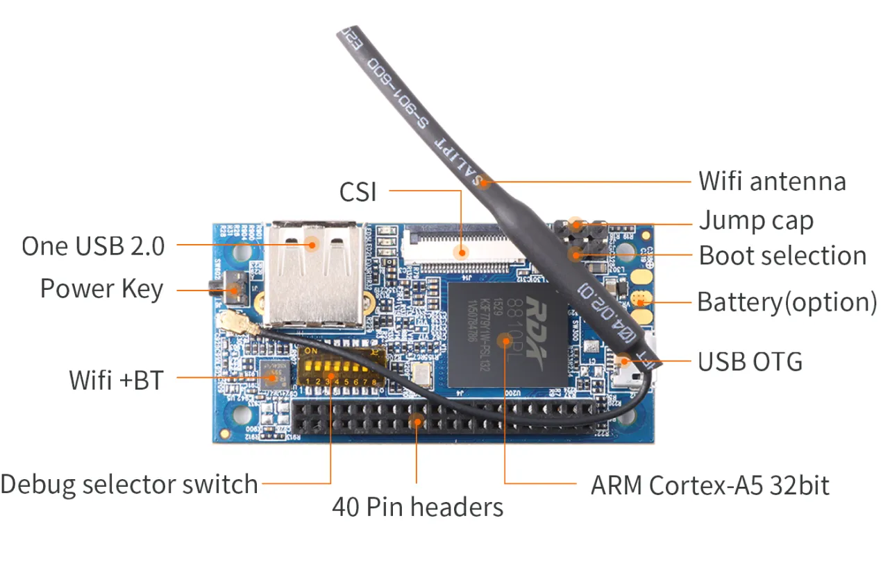 - Интерфейсы: USB 2.0 HOST, USB 2.0 OTG, 40-пиновый GPIO, UART (1×3)