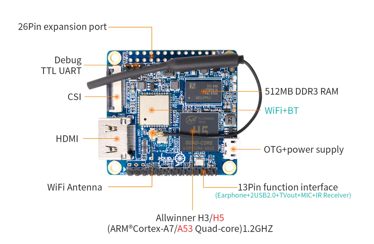 - Allwinner H3 (Cortex-A7) / H5 (Cortex-A53)
