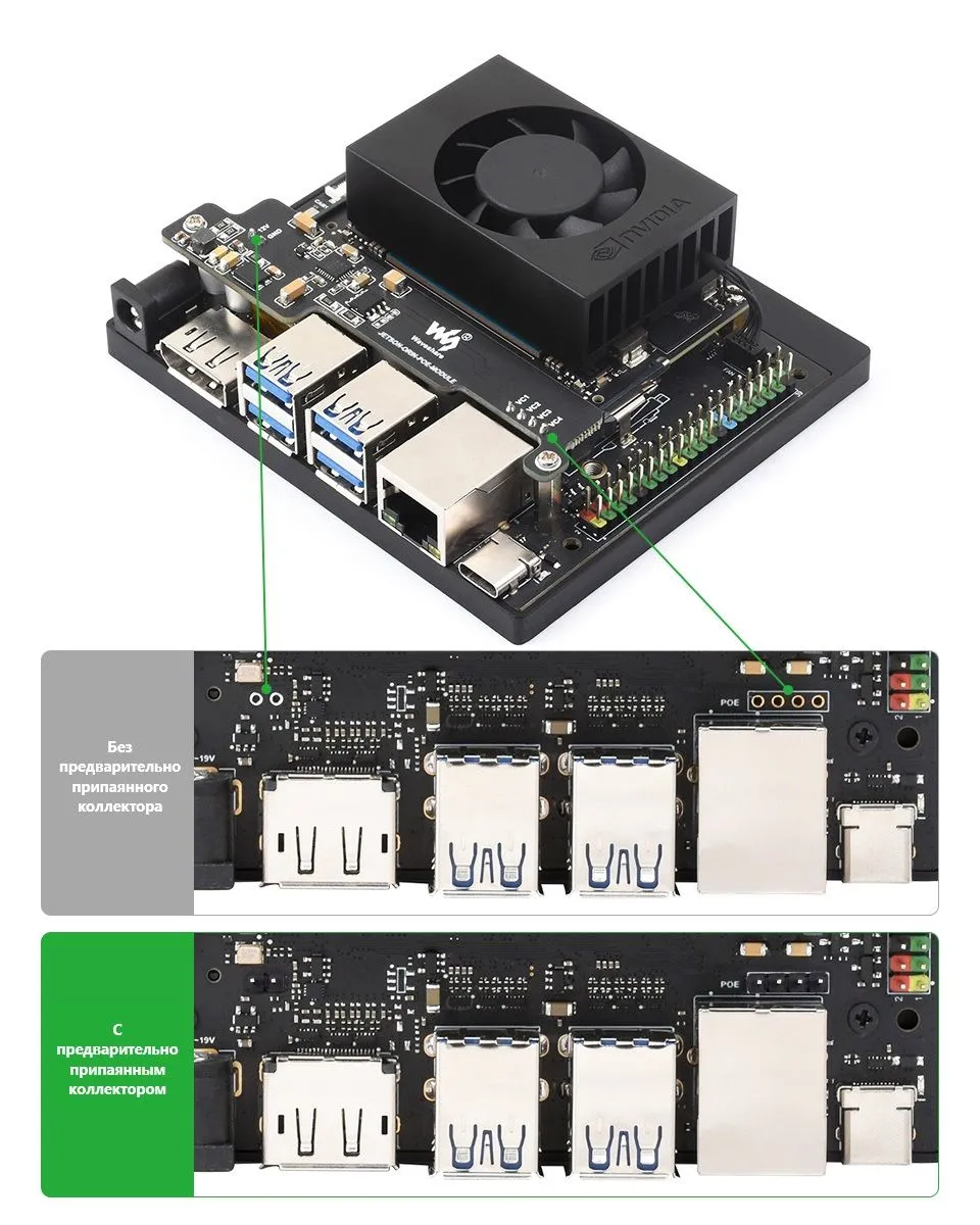 - Перед использованием модуля необходимо предварительно припаять соответствующий разъём (pinheader) для PoE на вашей материнской плате Jetson Orin Nano / NX
