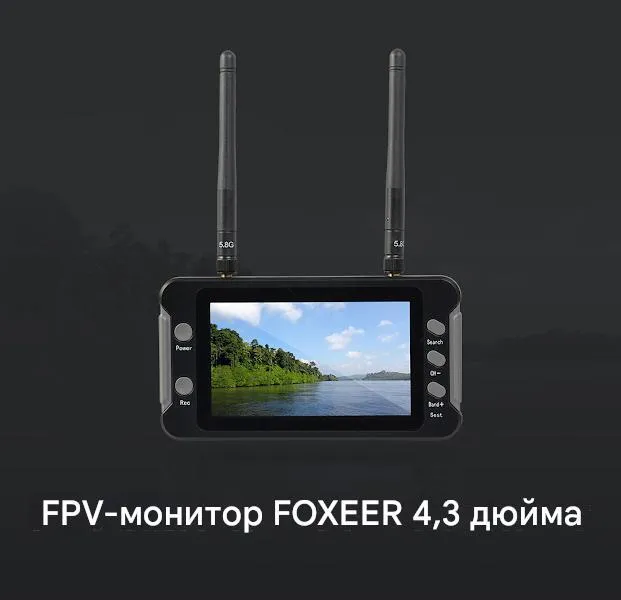 Компактный портативный FPV-монитор Foxeer формата «всё в одном» представляет собой законченное решение для наземной станции. Устройство объединяет 4.3-дюймовый экран с яркостью 500 кд/м², двойной (diversity) приёмник 5.8 ГГц на 40 каналов, функцию записи видео (DVR) и встроенный аккумулятор 1200 мАч. Благодаря тонкому корпусу (13 мм), малому весу (159 г) и возможности питания от USB или напрямую от LiPo-аккумулятора (5–23 В), монитор идеально подходит для крепления на пульт управления или использования в качестве автономного дисплея.