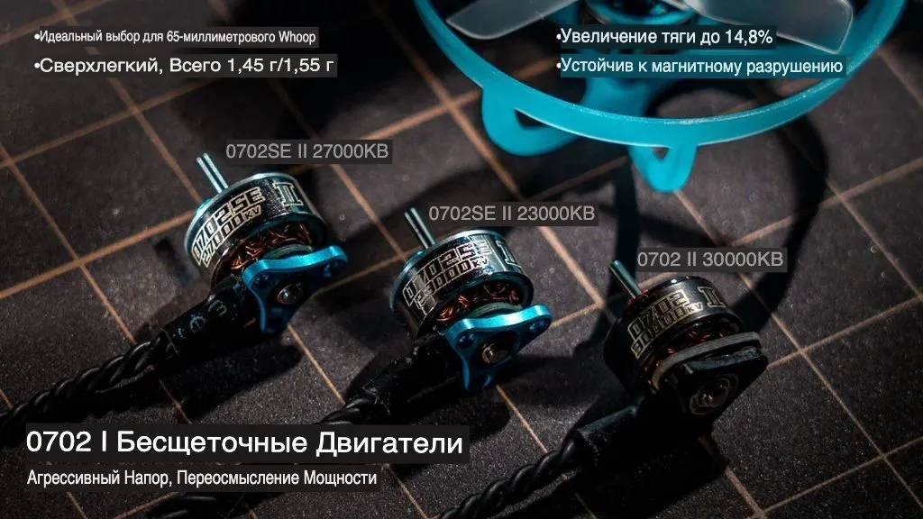 0702SE II 27000KV — это облегчённая версия бесколлекторного двигателя второго поколения, разработанная для ультралёгких 65мм Whoop-дронов с приоритетом минимального веса и эффективности. Мотор оснащён латунными втулками (brass bushings) и передовыми магнитами плиточной формы, обеспечивающими прирост тяги 12.7% при весе всего 1.47 г. Цвет корпуса — Ice Blue. Представляет собой более доступную и долговечную альтернативу флагманской модели, идеально подходящую для экстремально лёгких установок.