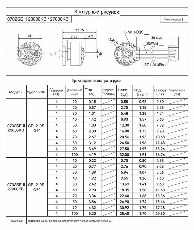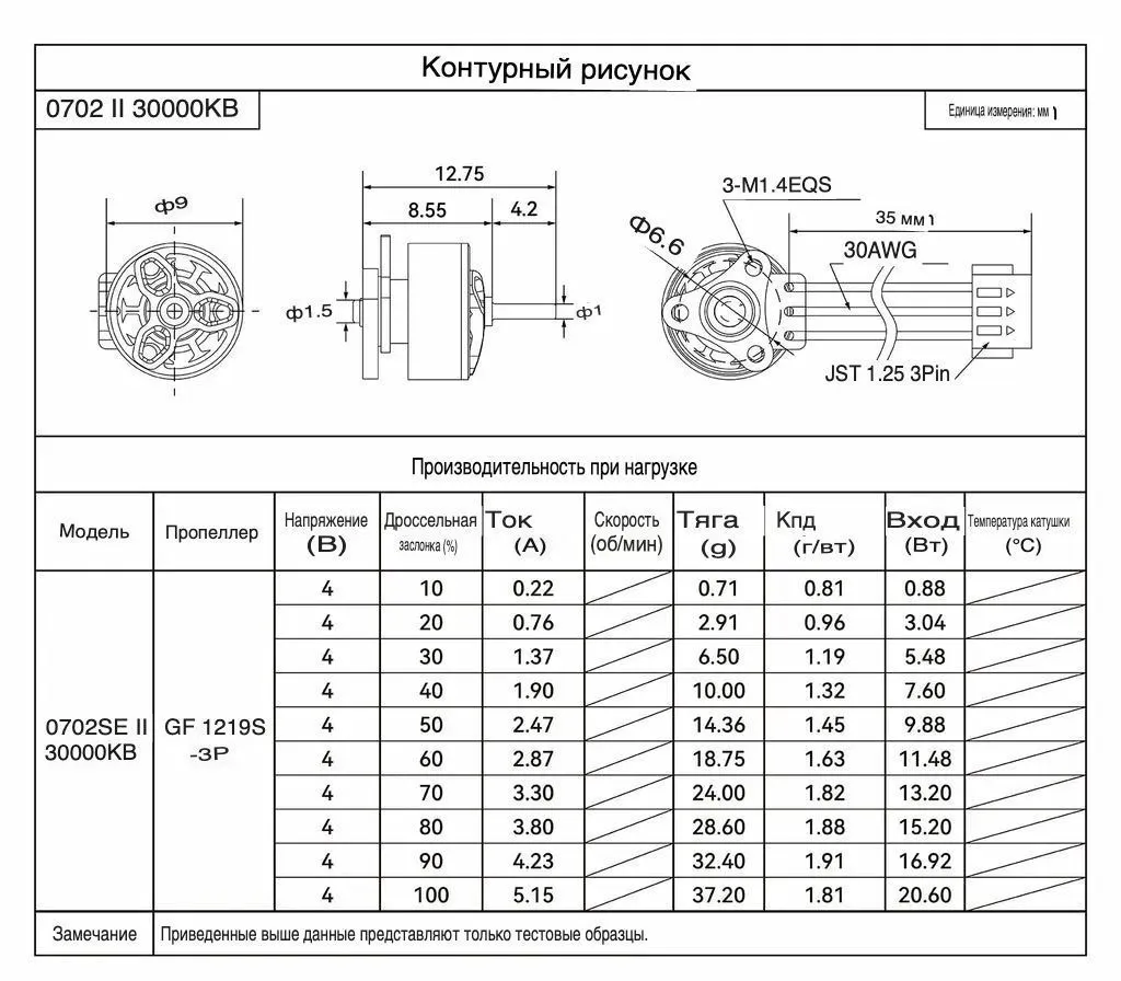 - Тяга (с пропеллером GF 1219S-3): 35.4 г