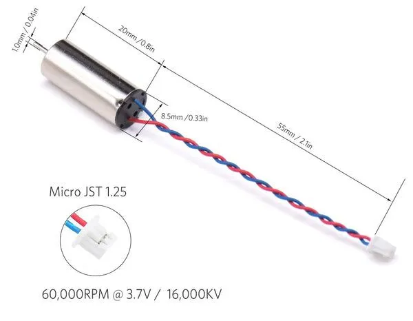 8.5x20mm 16000KV Brushed Motors — это комплект крупногабаритных коллекторных моторов, специально разработанных для 85мм Whoop-дрона Beta85. Моторы имеют размер статора 8.5×20 мм и скорость вращения 16000 KV (60 000 об/мин при 3.7 В), что делает их самыми мощными в линейке brushed-моторов BETAFPV. Предназначены исключительно для установки на раму Beta85 с использованием 48мм трёхлопастных пропеллеров и 1S HV-аккумуляторов ёмкостью 550 мАч. Поставляются в конфигурации 2CW+2CCW с предустановленными разъёмами JST 1.25мм 2P.