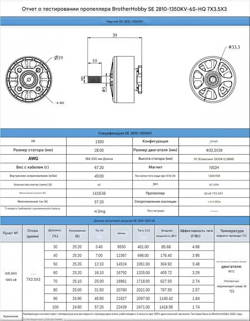 BrotherHobby SE 2810 — это высокопроизводительный бесколлекторный мотор, созданный для FPV-дронов с 7-дюймовыми пропеллерами, требующих высокой тяги, плавного отклика и надёжности при полётах на дальние дистанции.