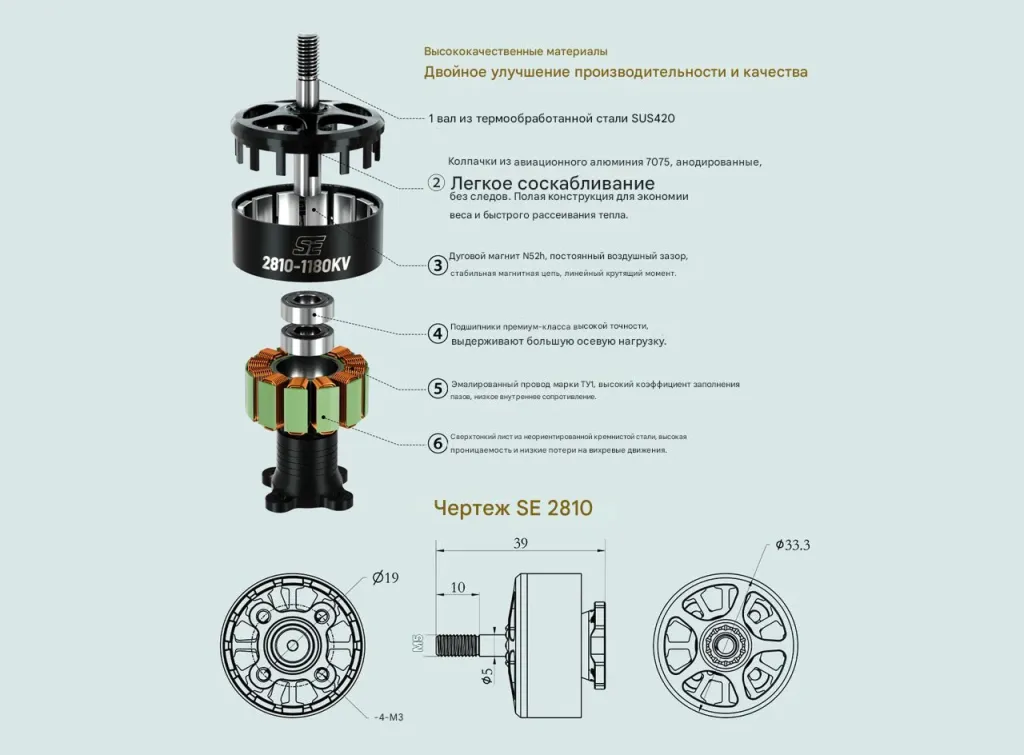 Благодаря увеличенному статору (28×10 мм) и тщательно продуманной конструкции, SE 2810 сочетает взрывную мощность, стабильность и высокую эффективность даже под большой нагрузкой.