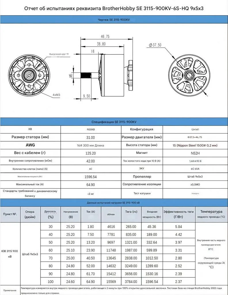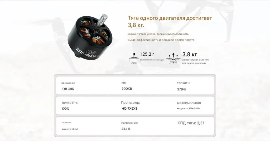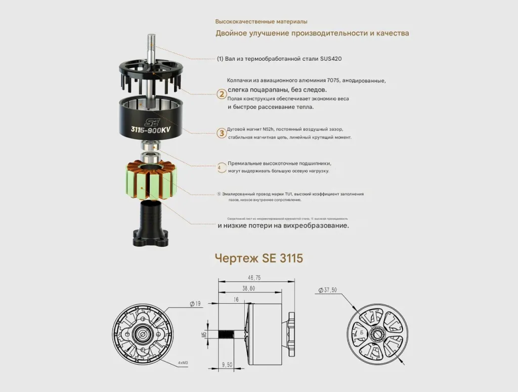 Модель SE 3115-900KV сочетает огромную тягу (до 3.8 кг), плавную работу и высокий КПД, обеспечивая стабильный полёт даже при большой нагрузке и длительном времени работы.