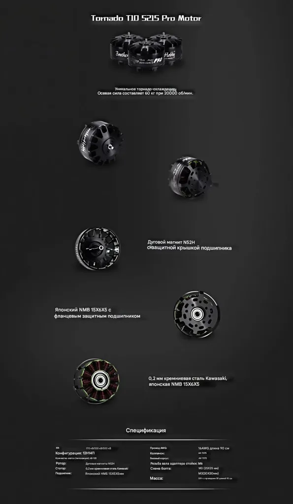 BrotherHobby Tornado T10 5215 PRO — серия мощных бесколлекторных моторов, созданных для тяжёлых дронов, платформ аэросъёмки и промышленных беспилотников. Двигатели отличаются высоким КПД, стабильной тягой и эффективным охлаждением даже при максимальных нагрузках.