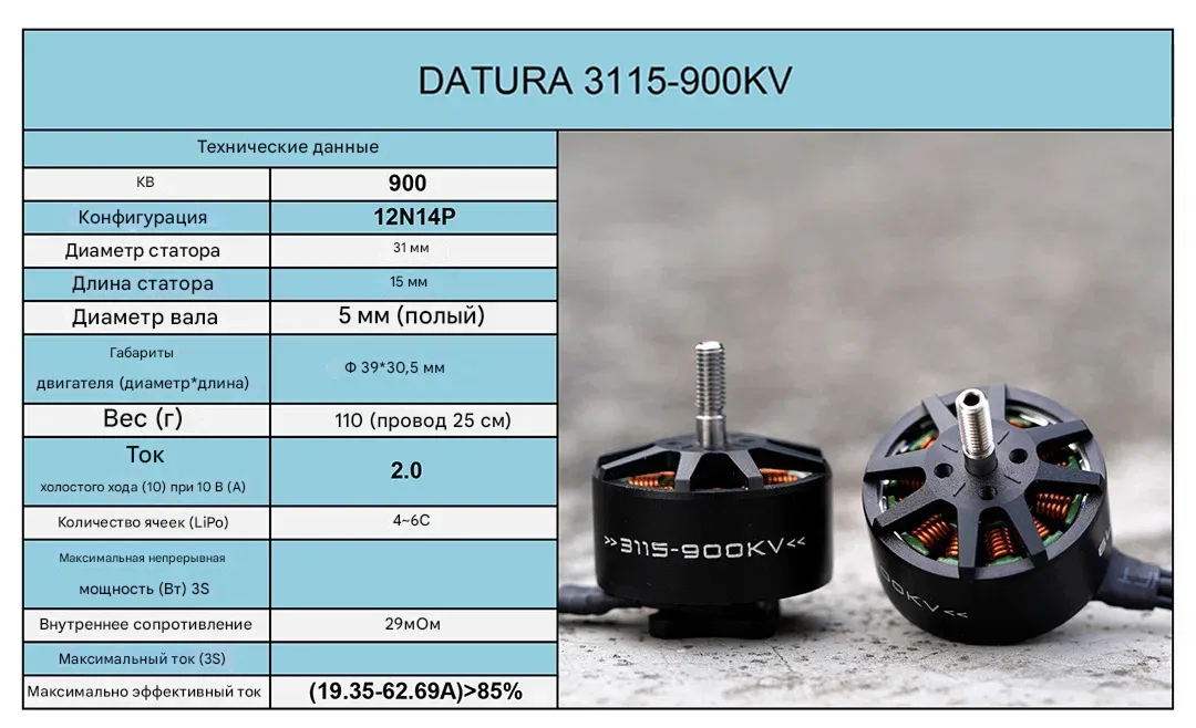 - Постоянная скорости (KV): 900 об/мин/В