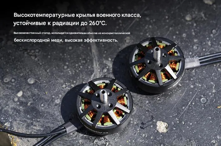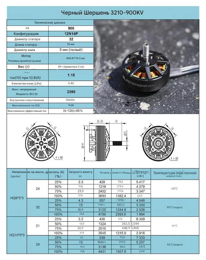 - Тяга 1324 г при 50% газа (эффективность 5.04 г/Вт), максимальная тяга 3545 г