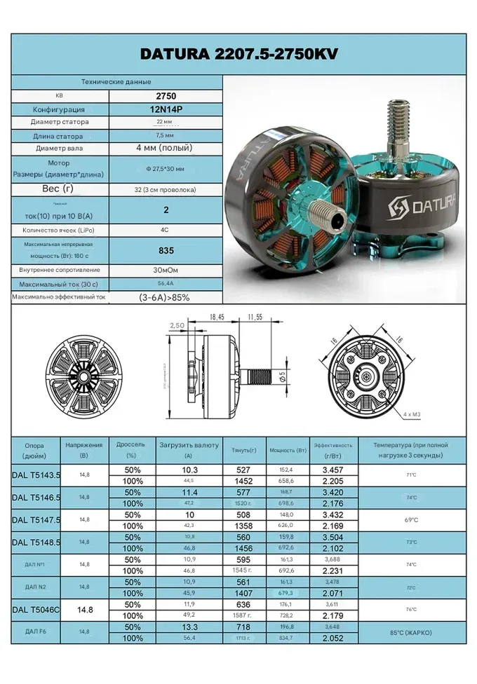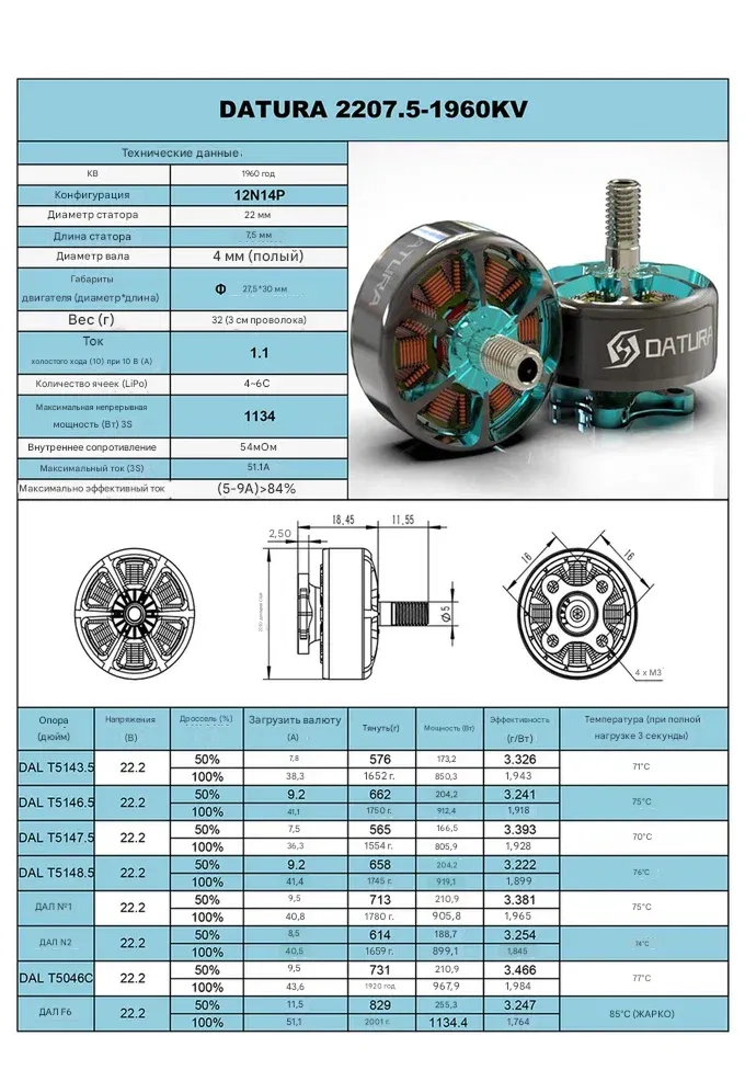 - Тяга 829 г при 50% газа, максимальная тяга 2001 г