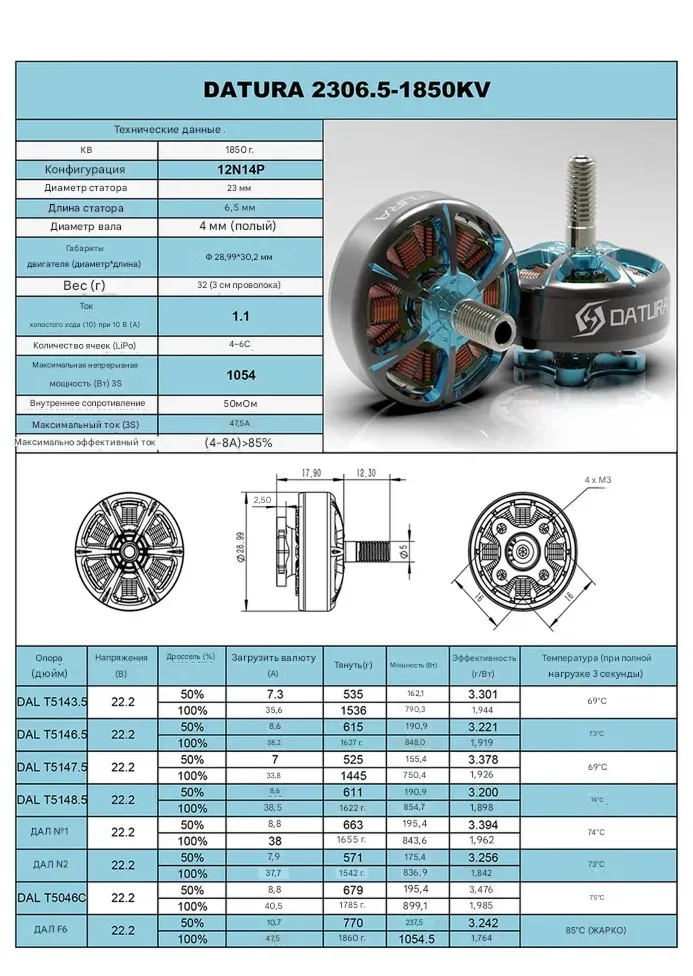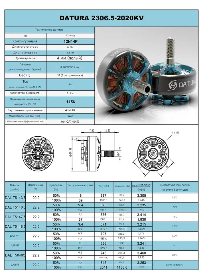 - Рекомендуемое напряжение питания: 4–6S LiPo (14.8–22.2 В)