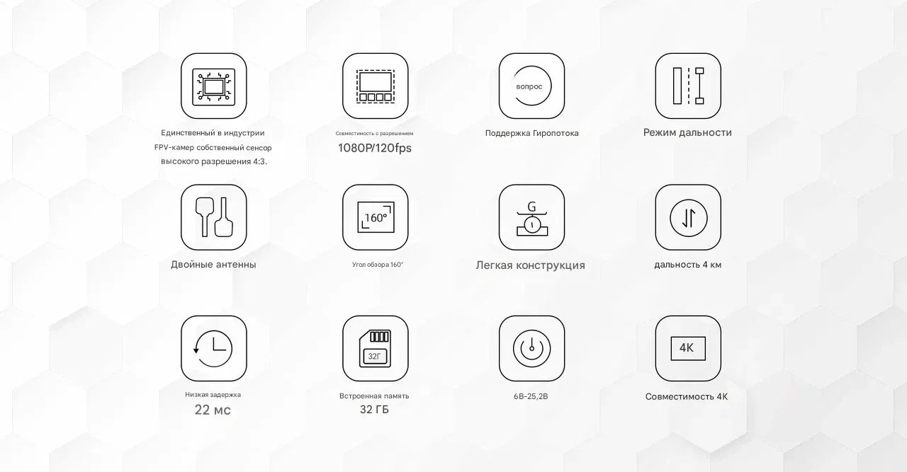 - Поддержка записи: 32 ГБ встроенной памяти (VTX) + DVR в очках (microSD до 256 ГБ)