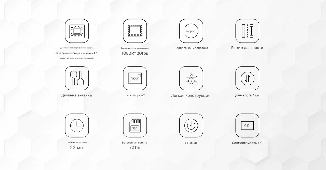 - Поддержка записи: 32 ГБ встроенной памяти (VTX) + DVR в очках (microSD до 256 ГБ)