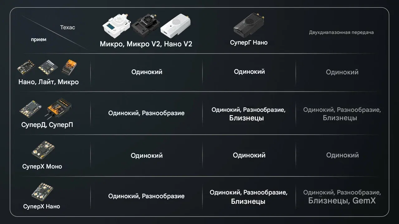 - Работает с TX-модулями: Micro/Micro V2/Nano V2/SuperG.