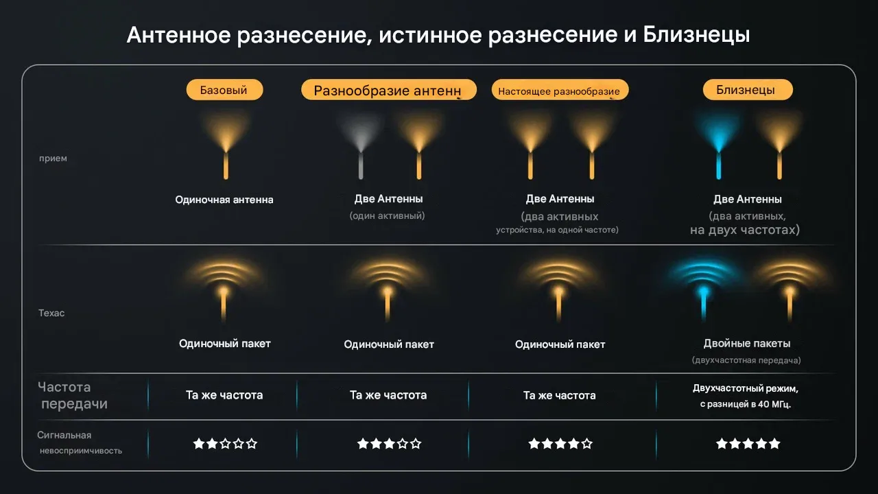 - 900M Gemini (915 МГц, дальнобойность), 2.4G Gemini (сверхнизкая задержка), 900M+2.4G Gemini Xrossband (GemX) — одновременная работа