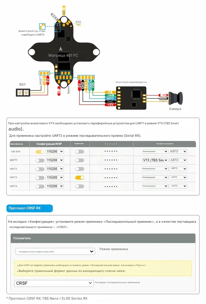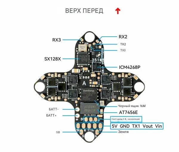 - UART1 (для VTX), UART2 (свободный), UART3 (под встроенный ELRS RX)