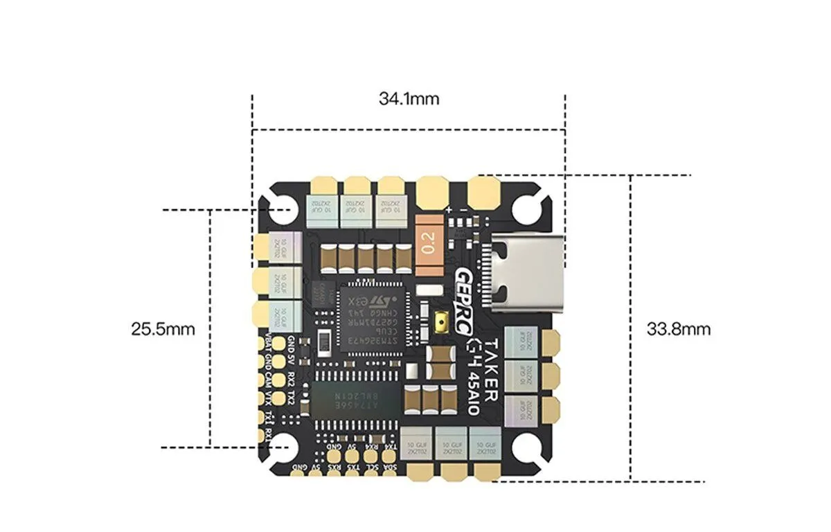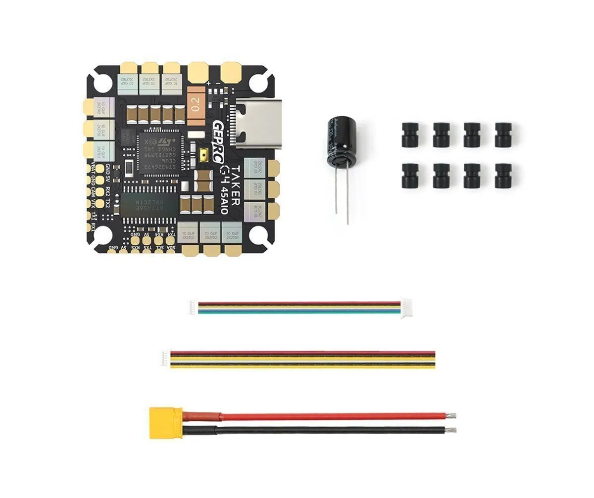 Полетный контроллер GEPRC TAKER G4 45A 8Bit AIO представляет собой компактное all-in-one решение, объединяющее полетный контроллер на базе STM32G473CEU6 и мощный 4-в-1 ESC на 45A. Гироскоп ICM42688-P обеспечивает высокую стабильность и точность управления. Контроллер оснащен токовым датчиком, мощным BEC 5V@3A для питания периферии и компактным Type-C USB для настройки. Вес составляет всего 9 г, что делает его идеальным выбором для производительных сборок дронов классов от 3 до 5 дюймов.