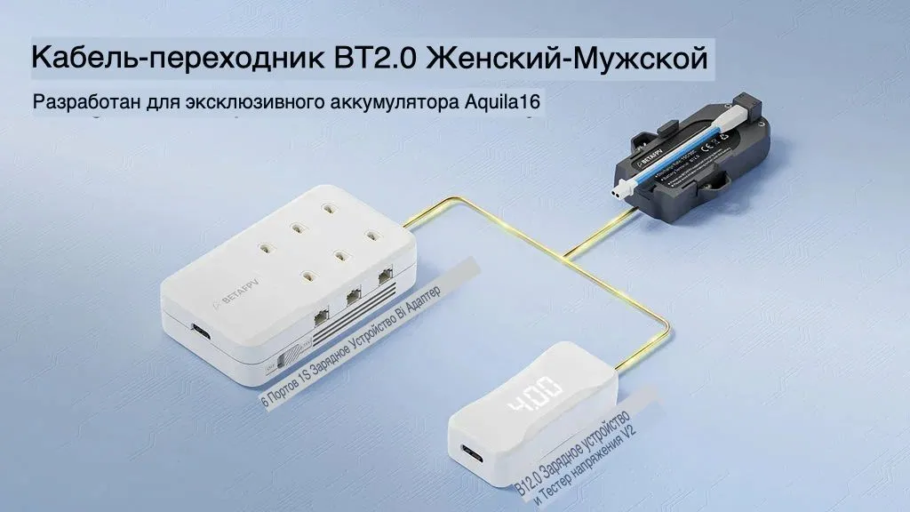 BT2.0 Female-Male Adapter Cable — это специализированный переходной кабель для подключения аккумуляторов с разъёмом BT2.0 к зарядным устройствам с таким же разъёмом. Разработан для зарядки эксклюзивных аккумуляторов дрона Aquila16 FPV Kit. Позволяет использовать стандартные многопортовые зарядные устройства (например, 6 Ports 1S Battery Charger & Adapter или BT2.0 Battery Charger and Voltage Tester V2) для зарядки BT2.0-батарей, что существенно повышает эффективность и удобство зарядки. Поставляется в наборах по 5 или 6 штук.