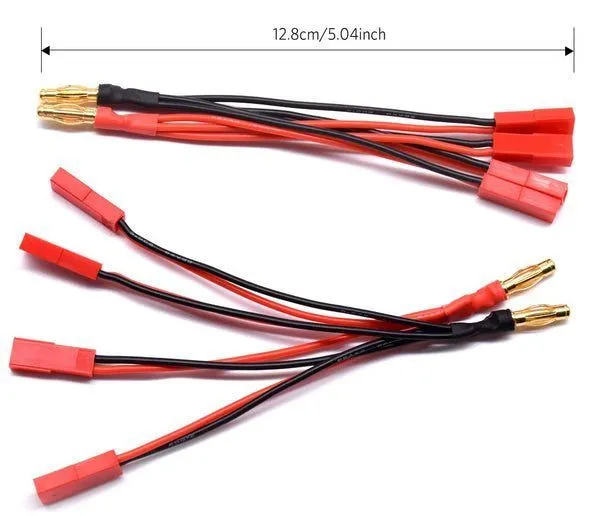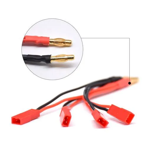 JST Charging Harness Charger Adapter Cable — это зарядный кабель-разветвитель, предназначенный для одновременной зарядки до четырёх 3S LiPo аккумуляторов с разъёмами JST. Кабель оснащён входными разъёмами 4mm Banana Plug (штекеры) для подключения к зарядному устройству и четырьмя выходными разъёмами Female JST для подключения аккумуляторов. Интегрированный балансирный разъём 3S обеспечивает корректную балансировку ячеек в процессе зарядки. Выполнен из высококачественного силиконового провода сечением 18 AWG, длина кабеля составляет 13 см. Поставляется в наборе из 2 штук.
