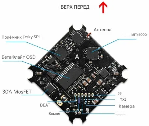 - Встроенные интерфейсы: SPI-приемник Frsky D16 (FRSKY_X) и BetaFlight OSD.