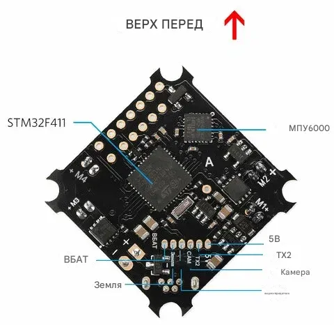 - Встроенный BetaFlight OSD (управление через SPI в режиме DMA)