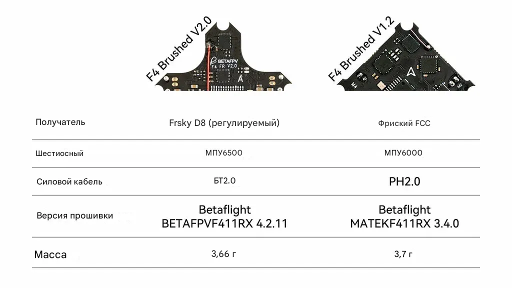 Классический полетный контроллер F4 Brushed возвращается с изменениями и новой формой. Оснащен встроенным чипом CC2500. Протокол по умолчанию с завода — Frsky D8, но его можно изменить на Frsky D16 FCC, Frsky D16 LBT или Futaba S-FHSS. Силовой кабель оснащен разъемом BT2.0 вместо PH2.0, что повышает производительность и обеспечивает совместимость с аккумуляторами серии BETAFPV BT2.0.