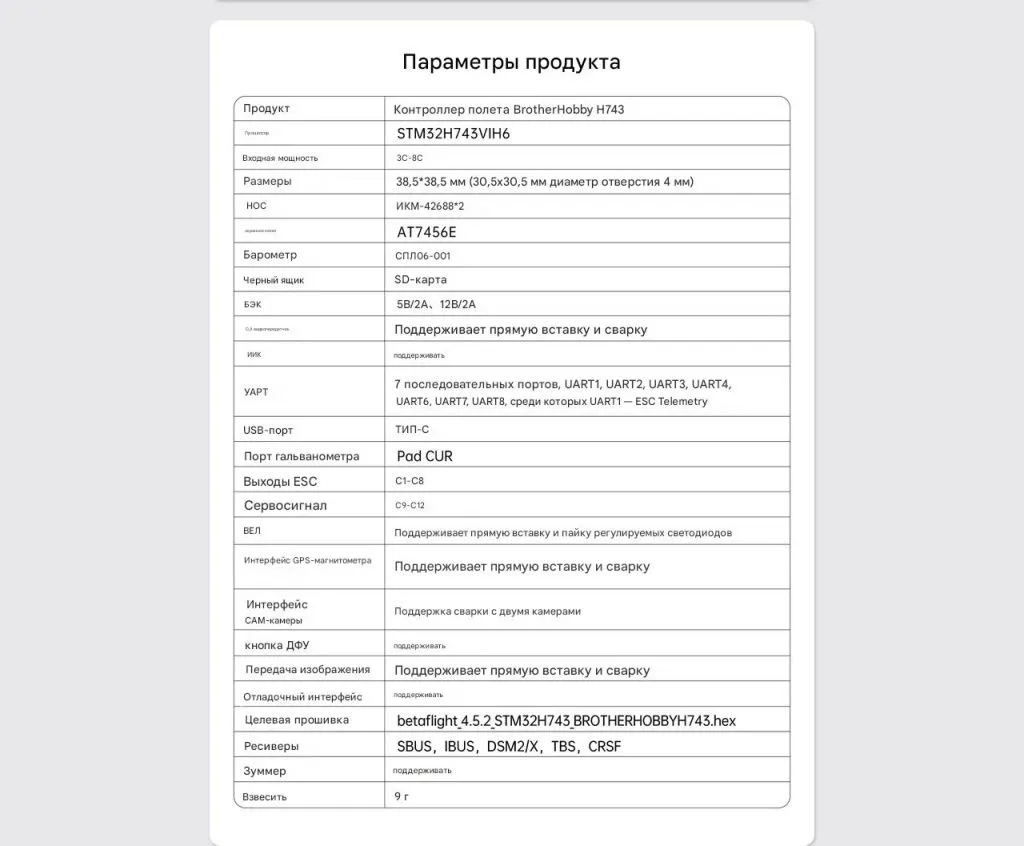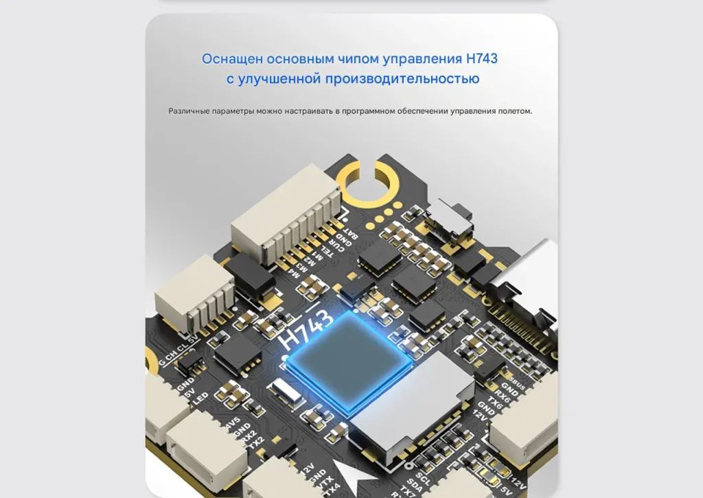 Он оснащён топовым процессором STM32H743VIH6, двумя гироскопами ICM-42688, барометром, поддерживает до 12 каналов управления и работает как с Betaflight, так и с Ardupilot.