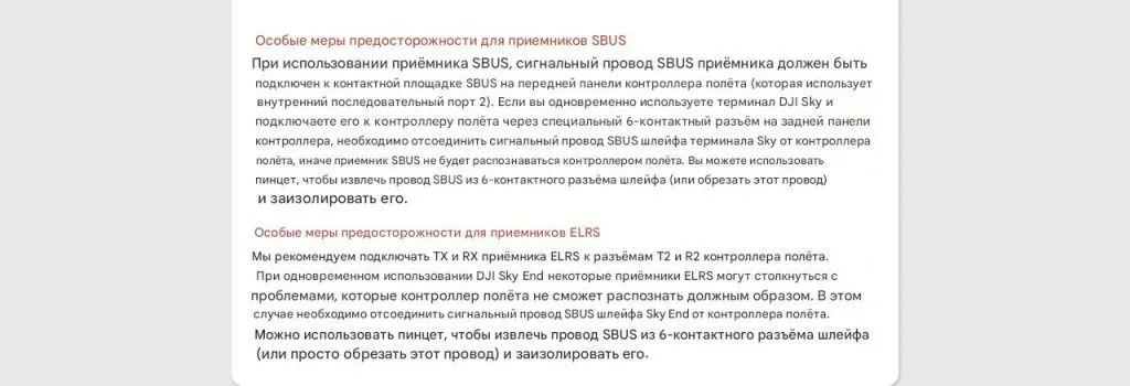 - рекомендуется подключение к T2 / R2; аналогично — при использовании с DJI нужно отключить SBUS-линию