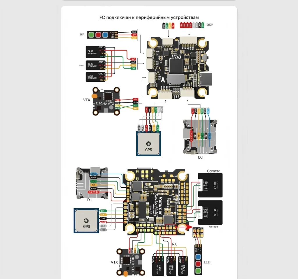 - Подключение камеры / VTX / GPS