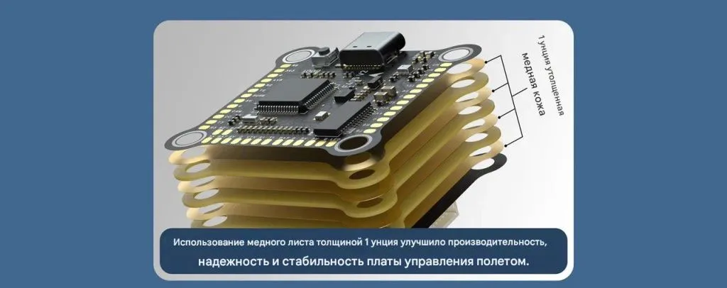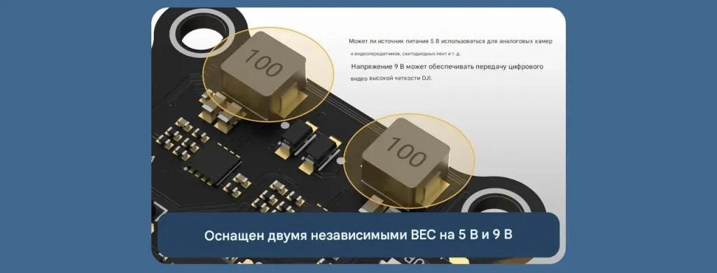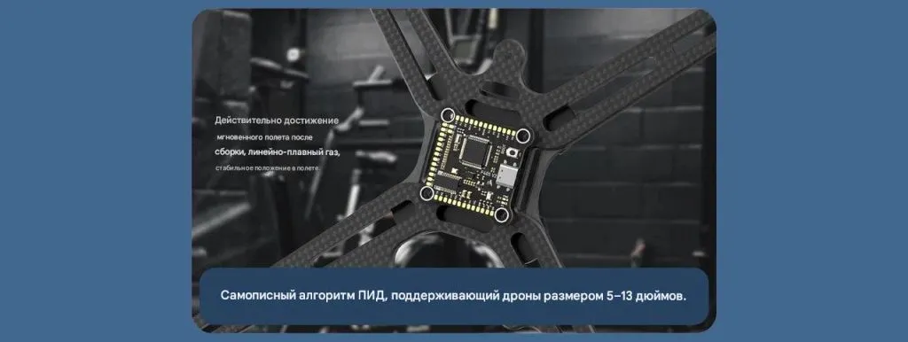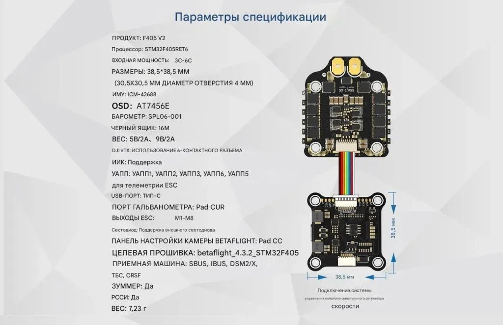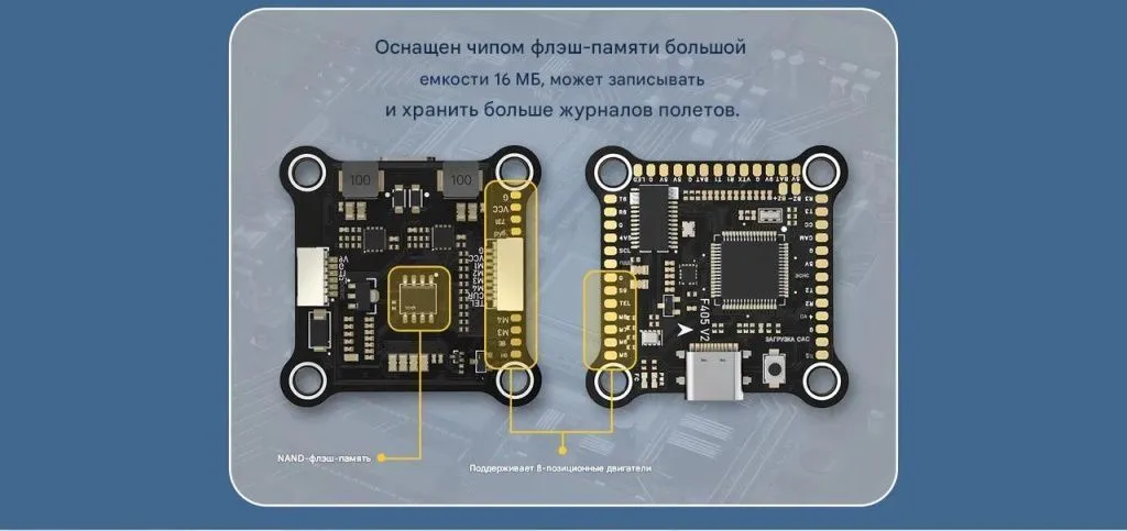 Он сочетает в себе мощный процессор STM32F405, точный гироскоп ICM42688, встроенный барометр, память 16 МБ для логов, и двойной независимый BEC (5 V + 9 V) для питания цифровых и аналоговых систем.