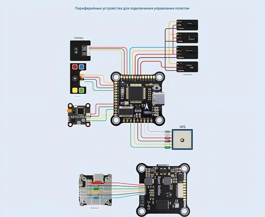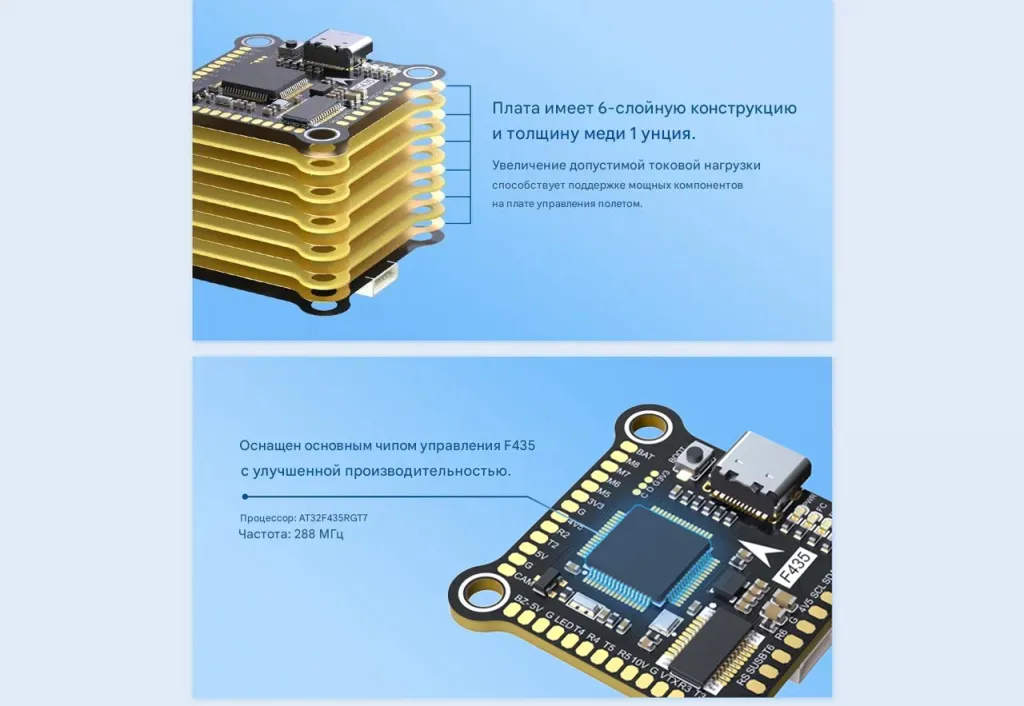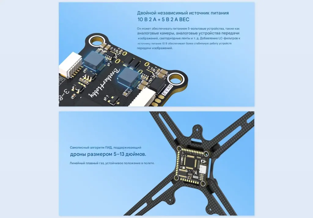 Он поддерживает до 8 моторов, двунаправленный DShot, прямое подключение DJI Air Unit и имеет двойной независимый BEC (5V/2A + 10V/2A) с LC-фильтрацией для стабильного питания.