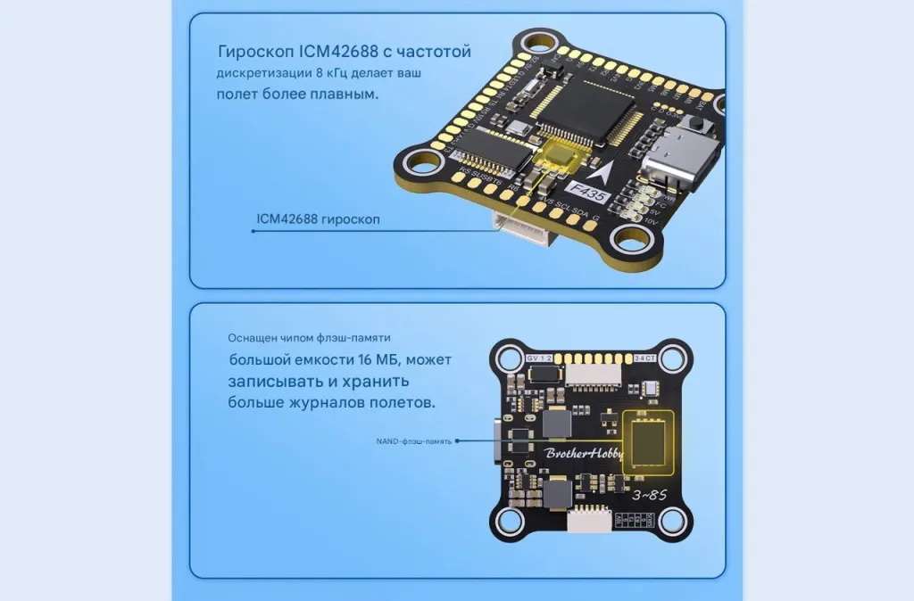 BrotherHobby F435 Flight Controller — это профессиональный полётный контроллер нового поколения, оснащённый мощным процессором AT32F435RGT7 (288 МГц), высокоточным гироскопом ICM42688, встроенным барометром SPL06-001 и 16 МБ флеш-памяти для логов.