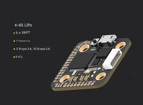 Компактный высоковольтный (HV) полетный контроллер формата Mini (30x31 мм) с поддержкой питания до 8S. Модель построена на базе процессора STM32F722RET6 и современного гироскопа ICM-42688-P, оснащена двойным BEC (5В/3А и 10В/2А) и 6 портами UART. Предназначен для мощных гоночных и фристайл дронов, а также для специальных применений, требующих высокой надежности и производительности в условиях расширенного диапазона напряжений.