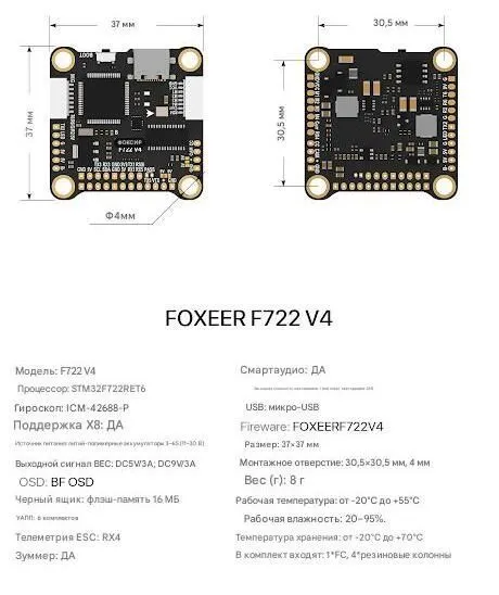 - Betaflight (целевая прошивка: FOXEERF722V4) / iNav (FOXEERF722V4 & FOXEERF722V4 X8)