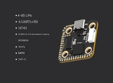 Высокопроизводительный полетный контроллер компактного формата Mini (30x31 мм) на базе процессора STM32H743 с гироскопом MPU6000 и барометром DPS310. Предназначен для требовательных гоночных и фристайл FPV-дронов, поддерживает питание до 8S и частоту обновления гироскопа до 32 кГц. Модель оснащена двойным BEC (5В/2А и 10В/2А), 6 полноценными UART + выделенным RX-портом для телеметрии ESC и продуманной компоновкой для удобного подключения цифровых систем DJI и HDZero.