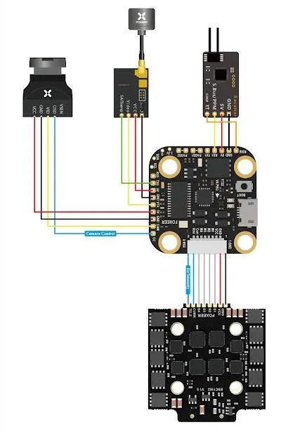 - Назначение: Установка на компактные гоночные и freestyle дроны, где важна аккуратная разводка и простота подключения VTX и приемников